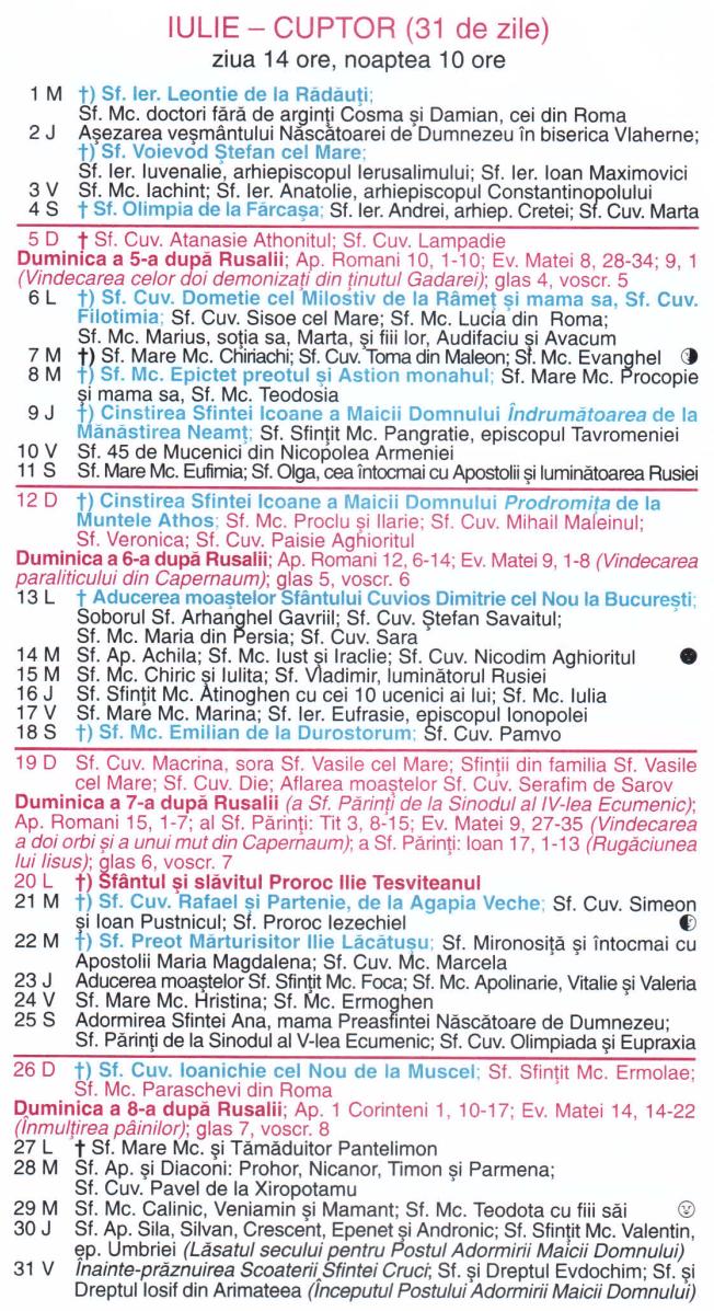 Calendar ortodox - Iulie 2026