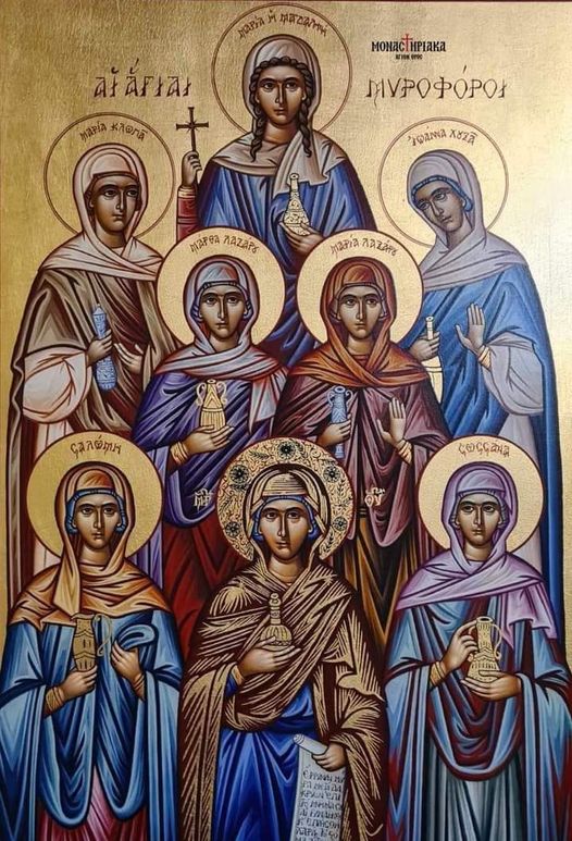 O, Sfintelor Femei Mironosiţe, cele ce v-aţi arătat vase pline de mirul darurilor Cuvântului, cu picăturile rugăciunilor voastre curăţiţi şi mintea noastră de gândurile cele lumești și deşarte, şi ca într-o carte nouă scrieţi cu condeiul Duhului şi cu Voia Tatălui, Taina Învierii Fiului! Cu adevărat aţi biruit toată îndoiala și frica, şi având picioarele voastre înfrumuseţate cu aripile Duhului, aţi alergat cu bucurie și curaj către Cel Care dăruieşte celor ce-L iubesc pe El zborul serafimilor ca să-L slăvească astfel pe Părintele Luminilor! Încă v-aţi și învrednicit a primi de la înger luminos vestea Învierii Celui Ce a biruit moartea şi a scos pe Adam din temniţele iadului. Prin voi s-a luminat toată ceata Apostolilor, şi prin ei până la marginile lumii s-a descoperit Puterea și Învierea Cel Nevăzut. Deci, şi noi fiind părtaşi tainei Învierii lui Hristos, vă rugăm pe voi, Sfintelor Femei Mironosițe, să cereţi Stăpânului să dea la o parte întunericul fricii și al neștiinței, și piatra răutăţii de la mormântul inimii noastre să o răstoarne, ca să răsară Cel împreună cu Care ne-am îngropat prin Botez, şi să umple de Har și Dar, și Bucurie Sfântă sufletele noastre! Fie ca Sfântul Înviat să ne dea și iertare de păcate, pocăinţă sinceră, curată, puterea de a birui asupra celui rău, şi vestea minunată a Mântuirii și a petrecerii în Veșnicie lângă El!